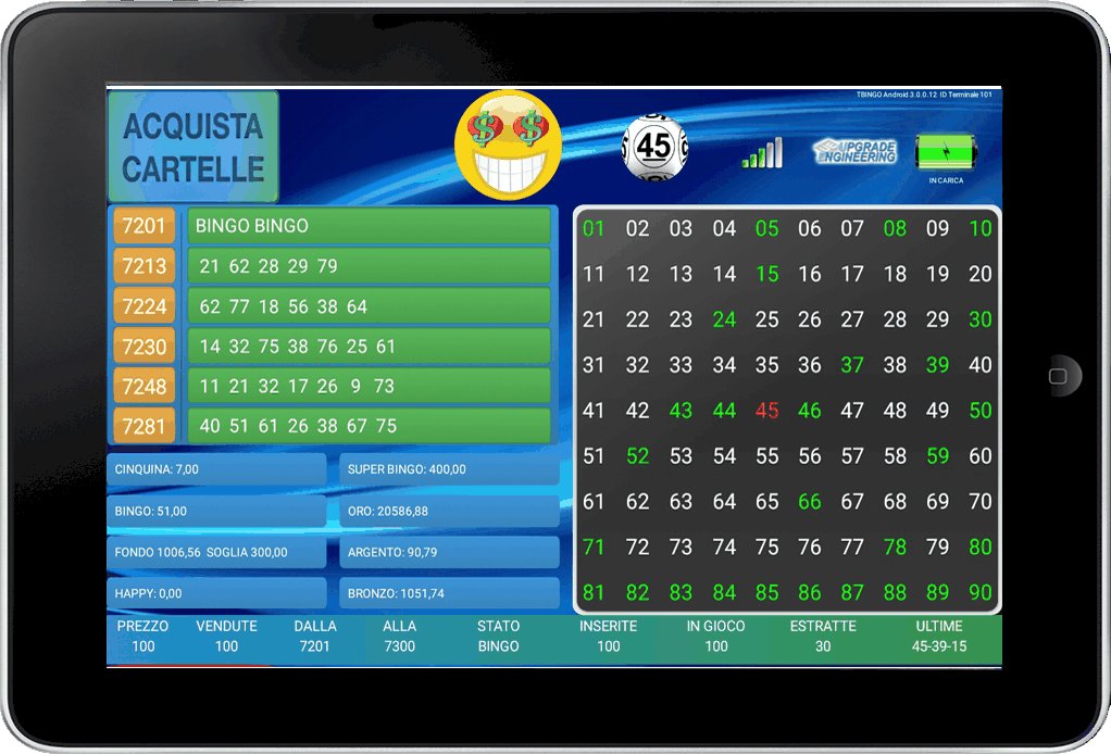Una schermata semplice, gli indicatori di stato batteria e segnale wi-fi con dati di vendita sempre ben visibili, rendono molto intuitivo e veloce il suo utilizzo da parte dei giocatori. Tra le altre caratteristiche troviamo ranking righe e cartelle, palla digitalizzata, suoni vincita personalizzabili.